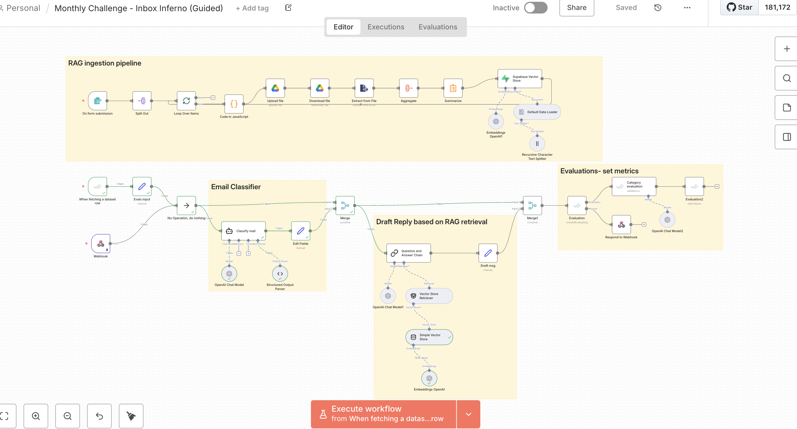 An AI-powered workflow built in n8n to process, analyze, and respond to high-volume inbox data using RAG (Retrieval-Augmented Generation) and evaluation datasets.